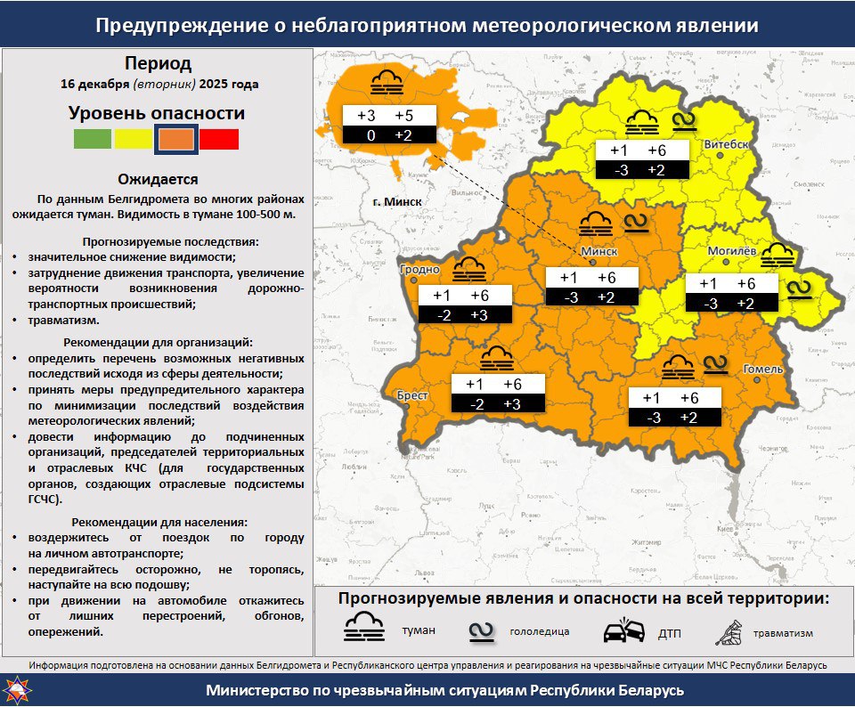 По данным Белгидромета во вторник, 16 декабря, на большей части республики будет туман.
