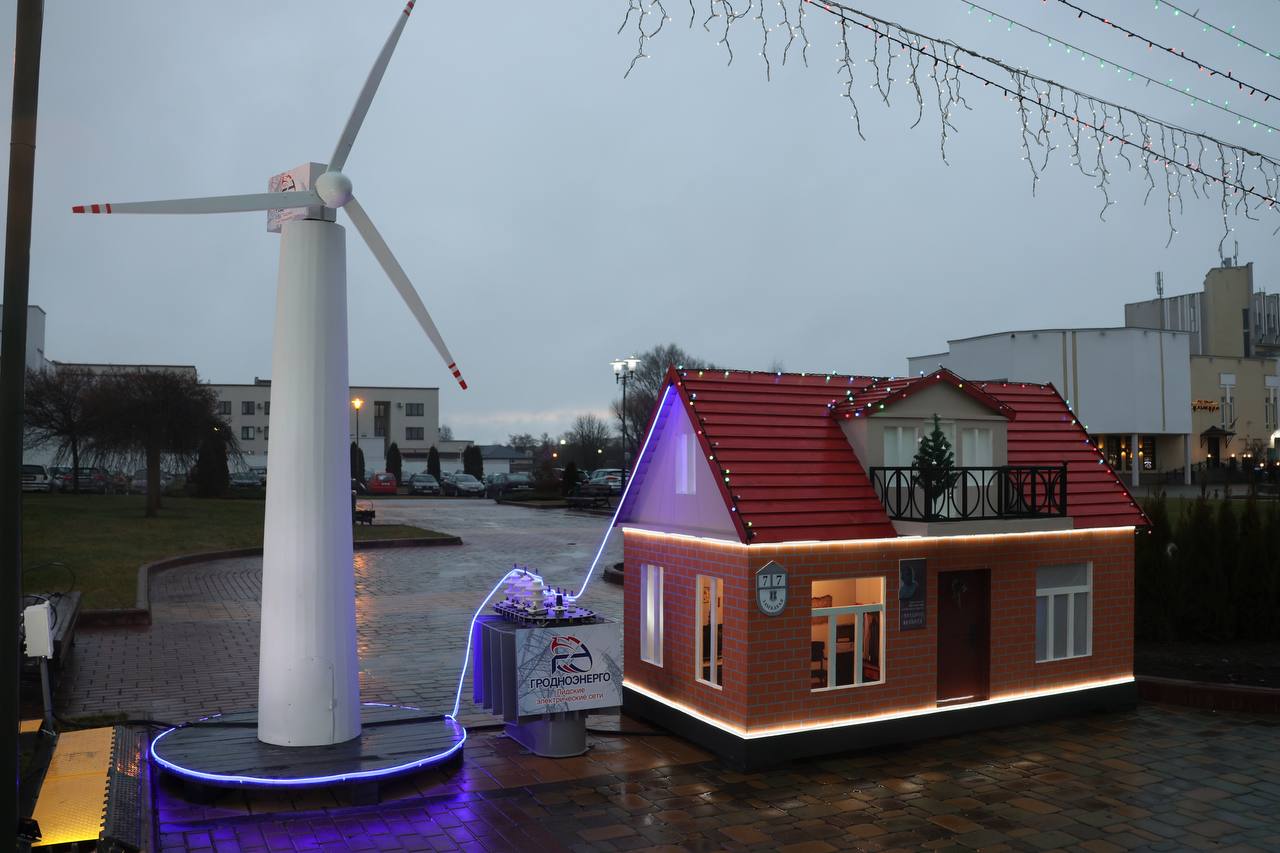 Одной из таких локаций стал Дом-музей Валентина Тавлая. Инсталляцию создали в филиале «Лидские электрические сети» РУП «Гродноэнерго». Здесь объединили и историческую память, и уютный зимний дух праздников, любовь к родному городу и, конечно же, энергетическую тему. За визуализацию энергосистемы отвечал макет ветрогенератора возле деревни Грабники.