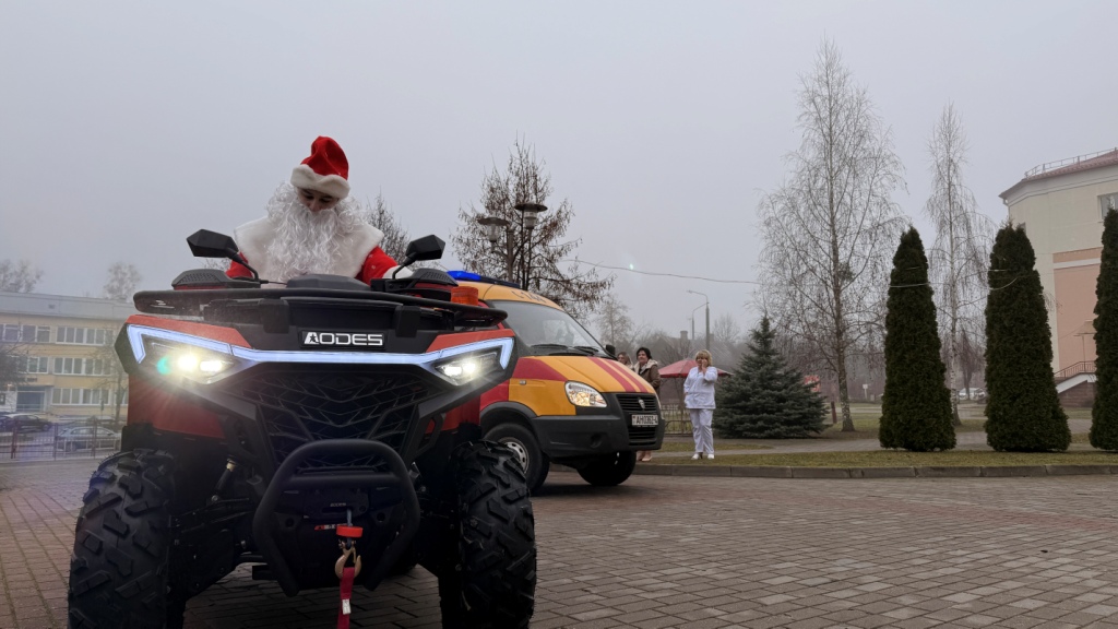 Энергетики в костюмах новогодних персонажей используя спецтехнику – квадроциклы и мобильную подъемную рабочую платформу доставят на высоту второго и третьего этажей больницы большие мешки с подарками: настольные игры, раскраски по теме «электробезопасность», карандаши и фломастеры, и, конечно же, много сладостей.