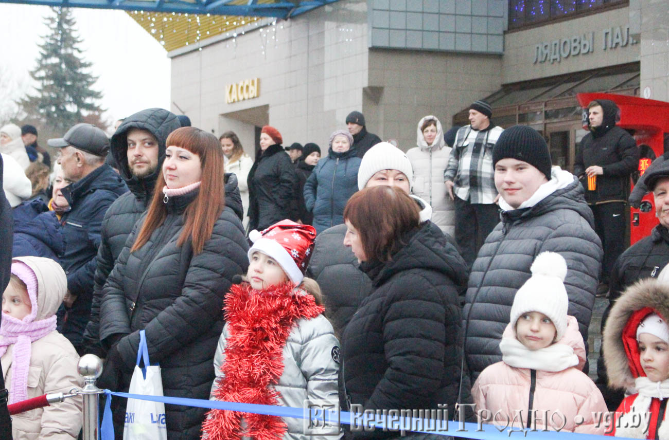 Все началось на стадионе. Но Дед Мороз на вертолете не прилетел. Виной тому густой туман и дождь. Непогода пришла в Гродно несколько дней назад. Летать такой погодой, да еще и над городом крайне опасно. Поэтому организаторы предоставили волшебникам другой транспорт, герои Нового года приехали на автомобиле. На сцене возле Ледового дворца Дед Мороз и Снегурочка устроили танцы, а затем фотографировались со всеми желающими.