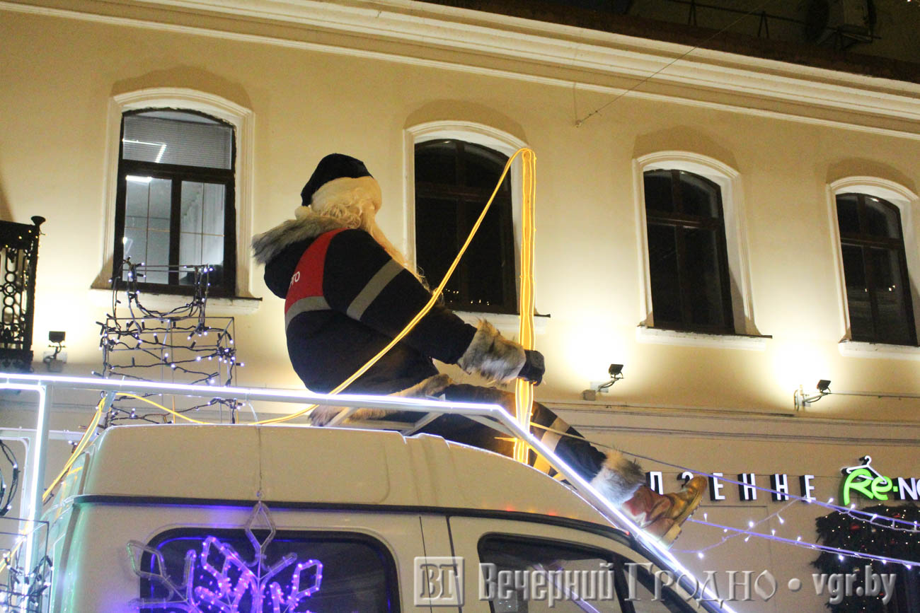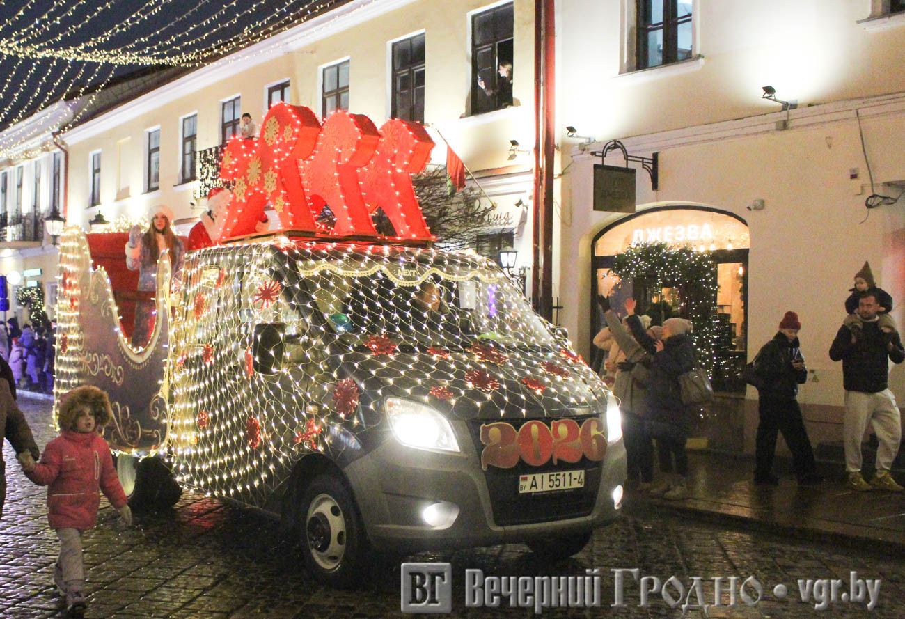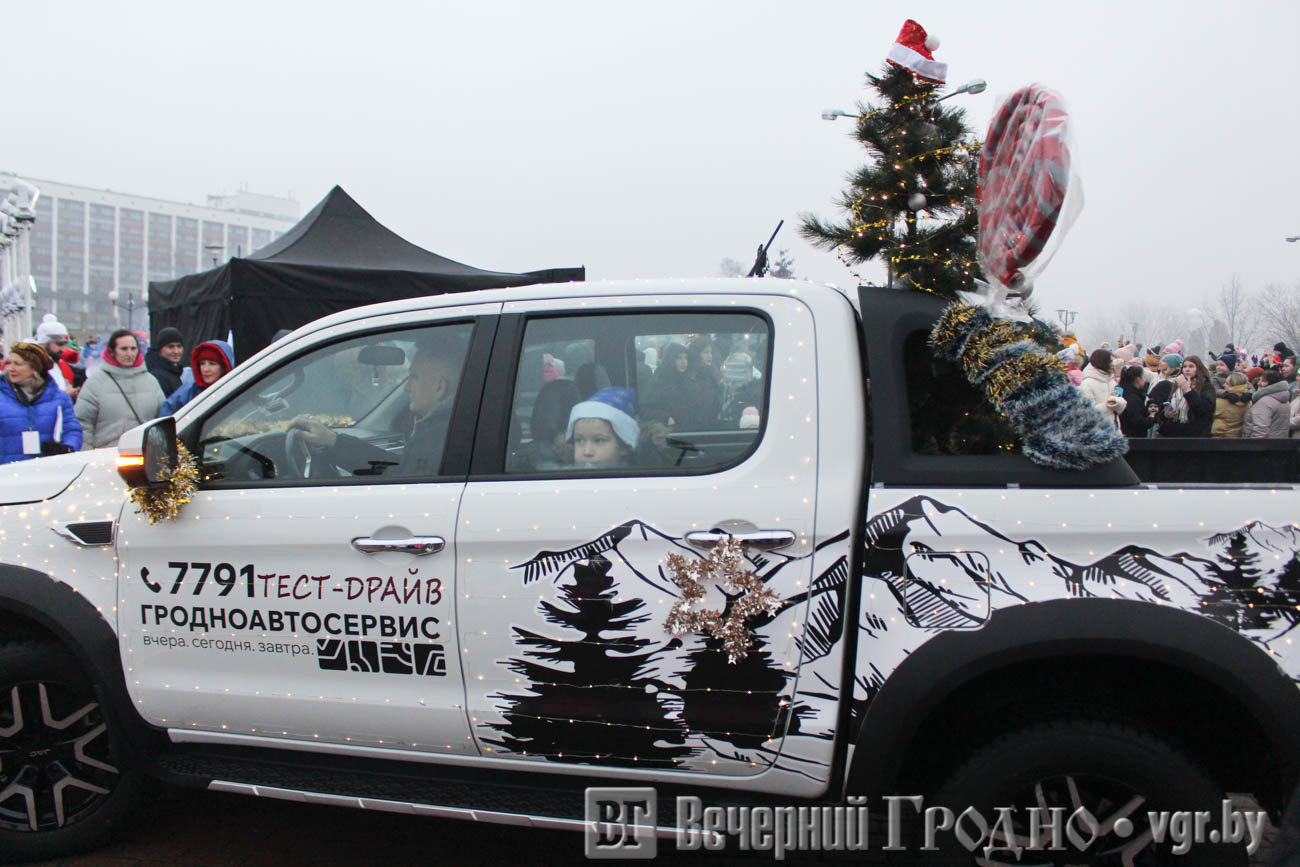 За людьми ехали новогодние платформы. «АзотСпецТранс», «Гродноэнерго», «Мясокомбинат» ярко украсили грузовые автомобили, но самой необычной была платформа «Молочного мира». К восторгу детей из кузова запускали огненные фонтаны и конфетти.