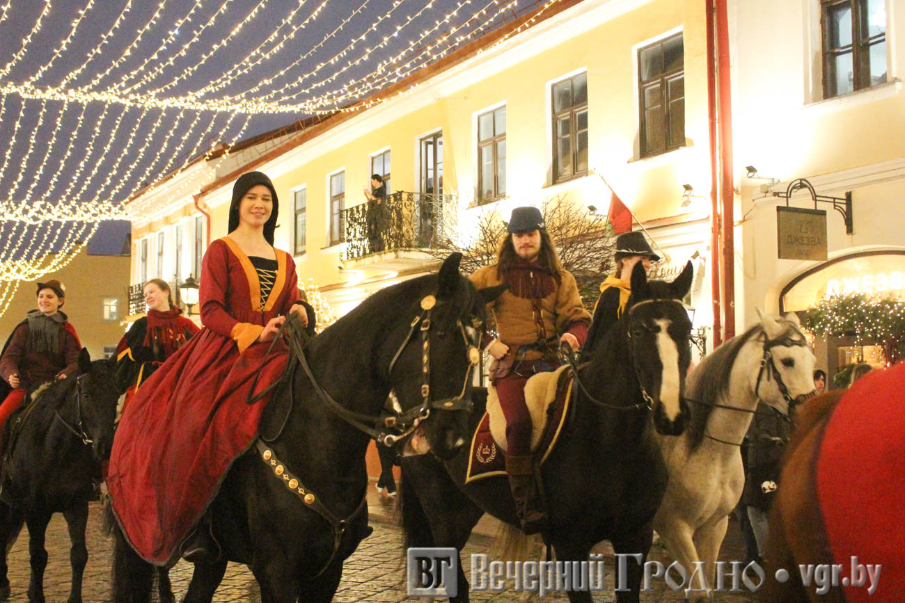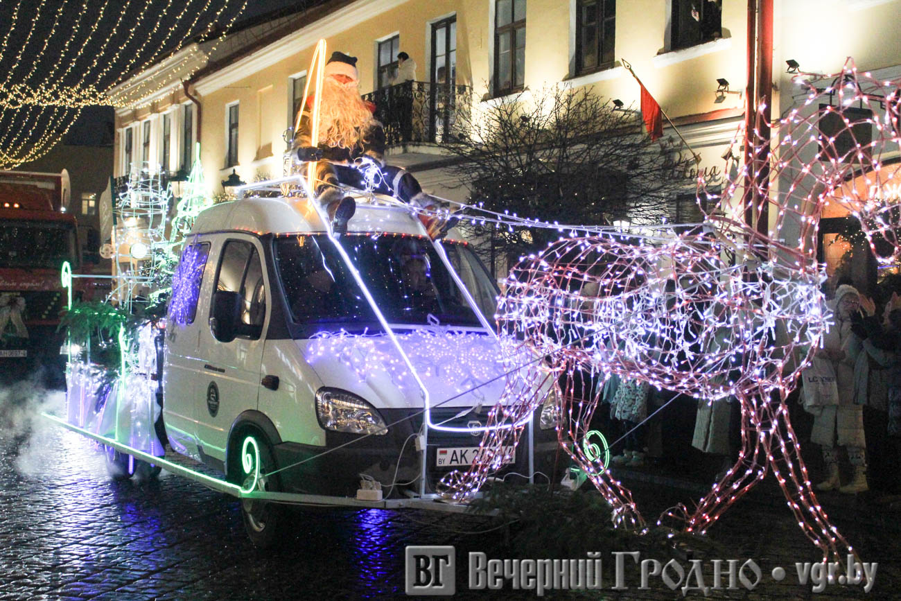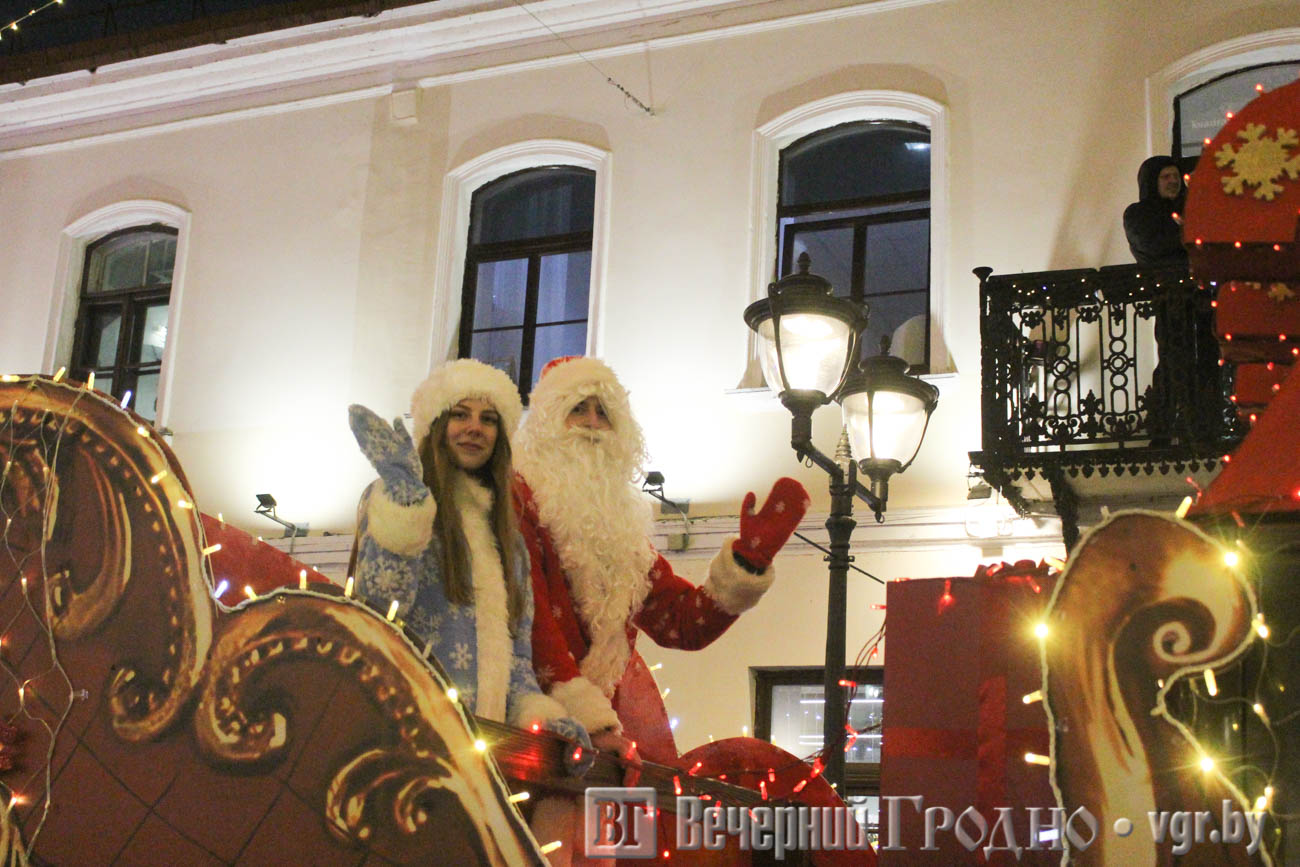 Дождь, огни и много лошадей — в Гродно тысячи людей встретили Деда Мороза и Снегурочку (видео)