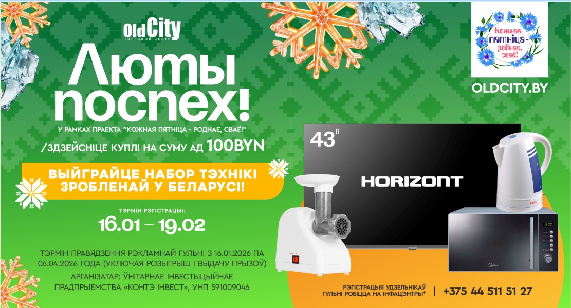 Торговый центр OldCity продолжает серию мероприятий в рамках республиканского проекта «Кожная пятніца – роднае, сваё». С 16 января по 20 февраля торговый центр запускает уникальную рекламную игру "Люты Поспех", где главный приз — набор современной бытовой техники белорусского производства.