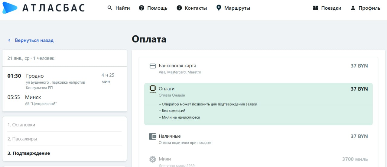 Сервис по продаже и бронированию билетов Атласбас объявил о начале совместной работы с платежной системой Оплати. Теперь при покупке билета онлайн пассажиру доступны несколько вариантов расчета: банковской картой или же при помощи системы Оплати. При этом нет разницы, какой способ выбран, стоимость билета останется неизменной.