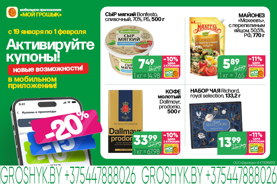 Теперь, с 19 января по 1 февраля, используя мобильное приложение «МОЙ ГРОШЫК», покупатели могут наслаждаться новыми эксклюзивными предложениями! Среди товаров, которые можно купить по специальной цене, — сыр мягкий, рыба и морепродукты, макароны, соленья, чай и кофе, шоколад, а также хозяйственные принадлежности.