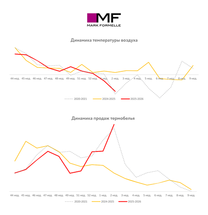 Так, только с 5 по 11 января 2026 года продажи термобелья Mark Formelle выросли в 3,6 раза в сравнении с аналогичным периодом прошлого года. Такой же пиковый спрос наблюдался около 5 лет назад при схожей погоде.