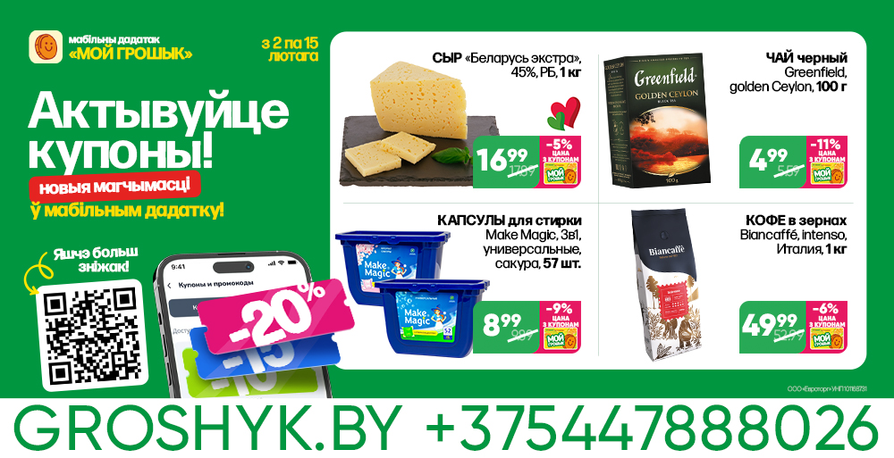 Мы уже рассказывали о возможности экономить с помощью купонов в мобильном приложении «МОЙ ГРОШЫК». В этот раз по специальной цене со 2 по 15 февраля можно приобрести чай и кофе, сладости, бытовую химию, средства гигиены и многое другое. В дискаунтерах «Грошык» они обозначены специальными надценниками. Вот лишь некоторые из этих товаров: