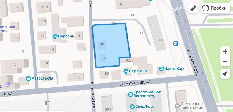 Площадь участка под строительство — примерно 25 соток. Если быть точным, расположен он у пересечения улицы Куйбышева и 5-го переулка Куйбышева. Здесь находятся деревья, подземные инженерные коммуникации и, самое главное, капитальные строения, которые необходимо снести. Их два, оба — на 5-м переулке Куйбышева (№ 20 и 22).