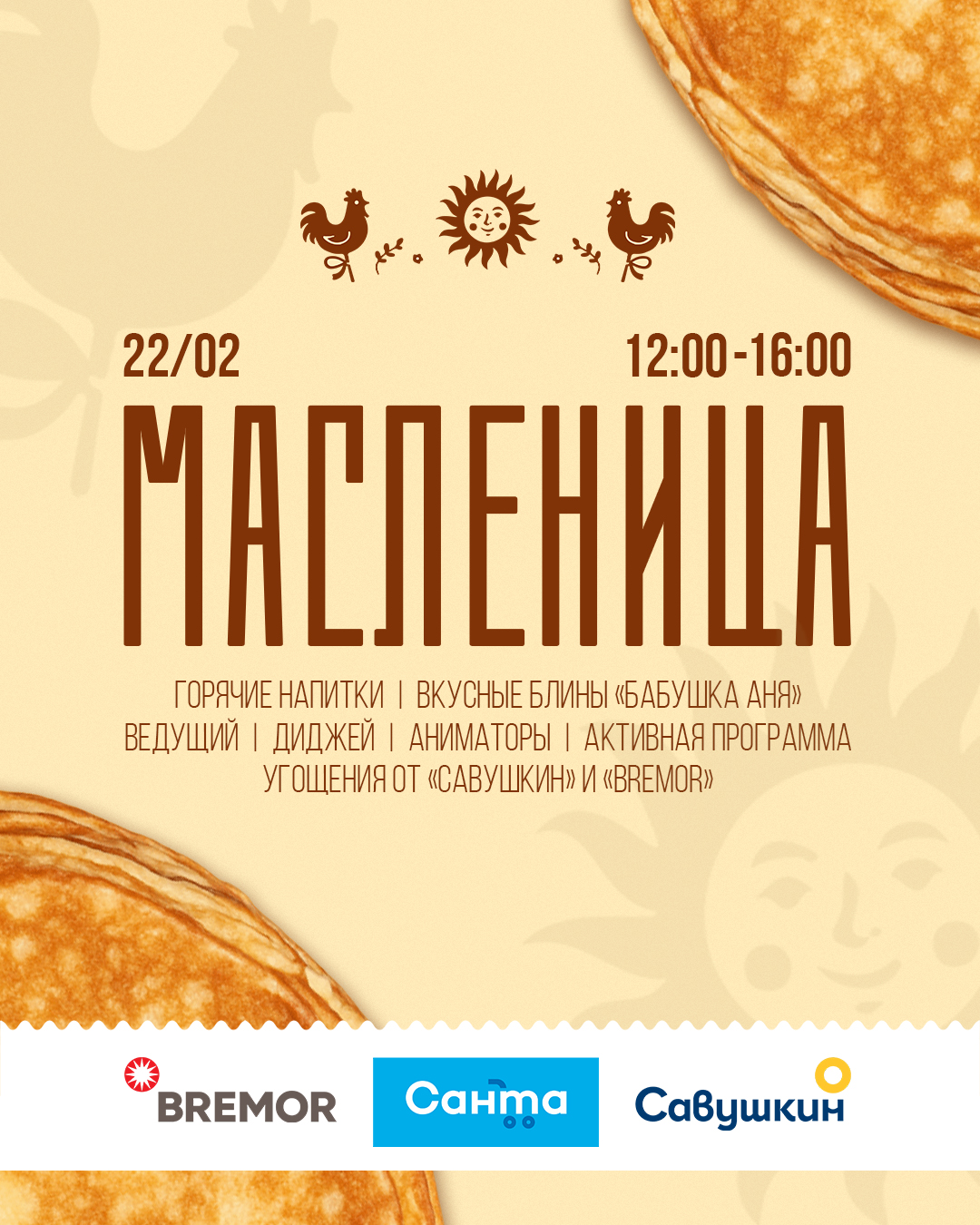 Всех, кто уже устал от холодной зимы, торговая сеть «Санта» приглашает на празднование Масленицы. В воскресенье, 22 февраля, площадка у магазина на ул. Огинского, 2 в Гродно превратится в место притяжения для всех, кто хочет весело проводить зиму и встретить весну.