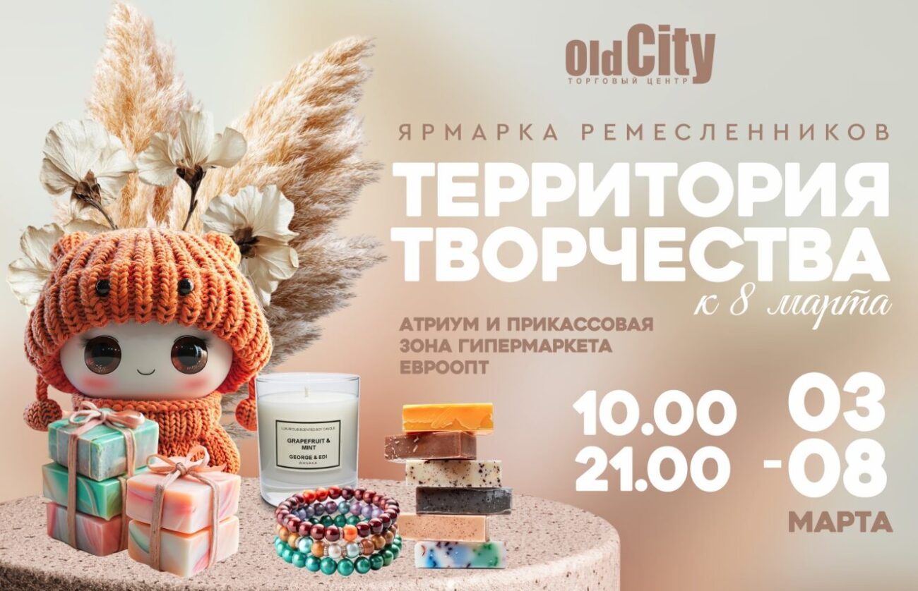С 3 по 8 марта в торговом центре OldCity открывается праздничная ярмарка ремесленников «Территория творчества». Здесь вы найдёте тысячи идей для душевных подарков к Международному женскому дню!