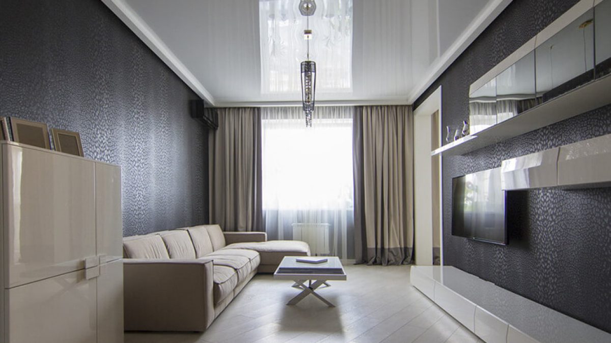 Проектировщики располагают глянец над зоной гостиной для увеличения освещенности. Матовые участки монтируют над спальным местом для формирования спокойной обстановки. Соединительный профиль между фрагментами делает шов аккуратным и прочным.