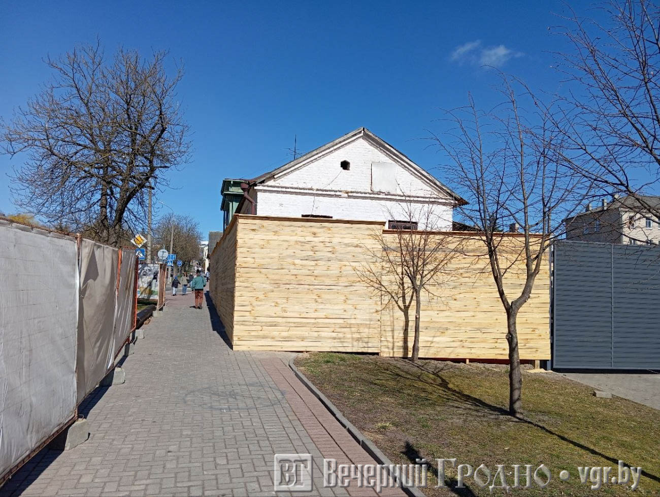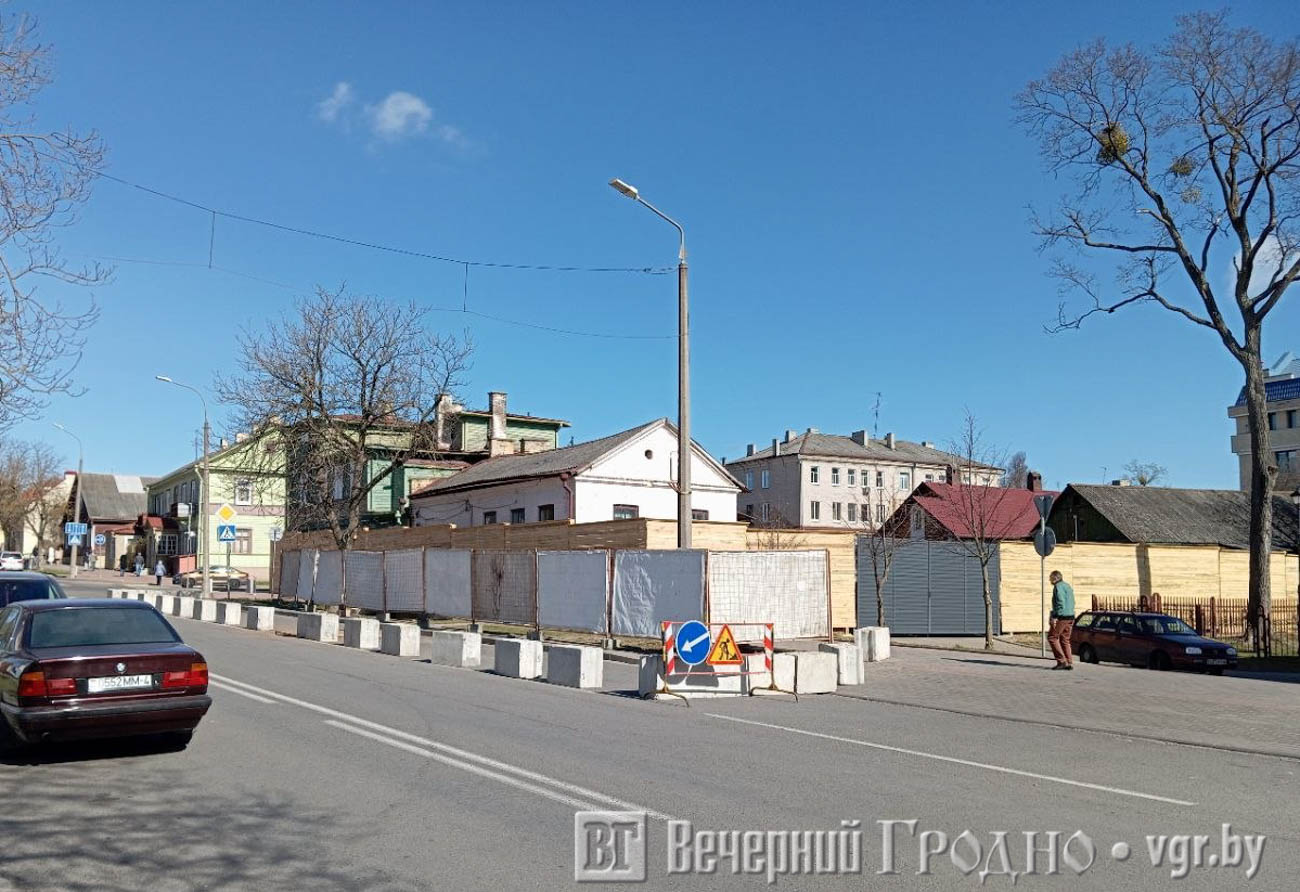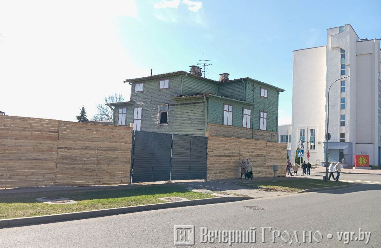 Напомним, дом находится на пересечении улиц Мицкевича и Митрополита Филарета напротив администрации Ленинского района. Ранее в его подвале размещался мясной магазин одного из хозяйств Гродненского района. Здание полностью обнесли высоким забором, частично перекрыты пешеходная дорожка и проезжая часть.