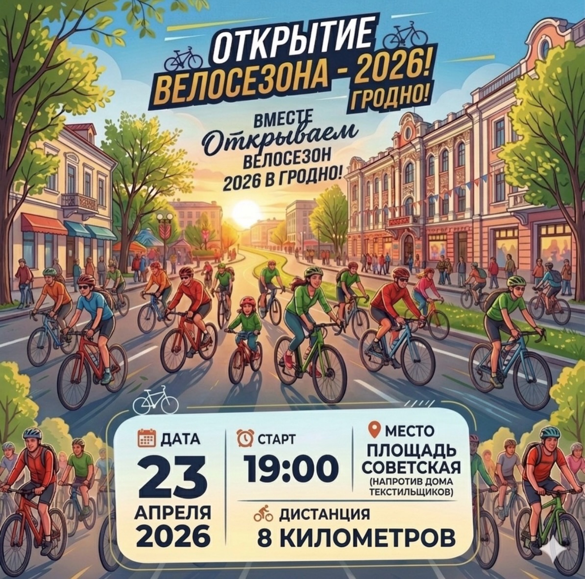 Сбор участников будет на Советской площади, стартует заезд в 19 часов. Гродненцам предложат проехать 8 километров. Дистанция будет проходить по проспекту Космонавтов, Румлевскому мосту, проспекту Янки Купалы и Старому мосту. Старт и финиш — на Советской площади.