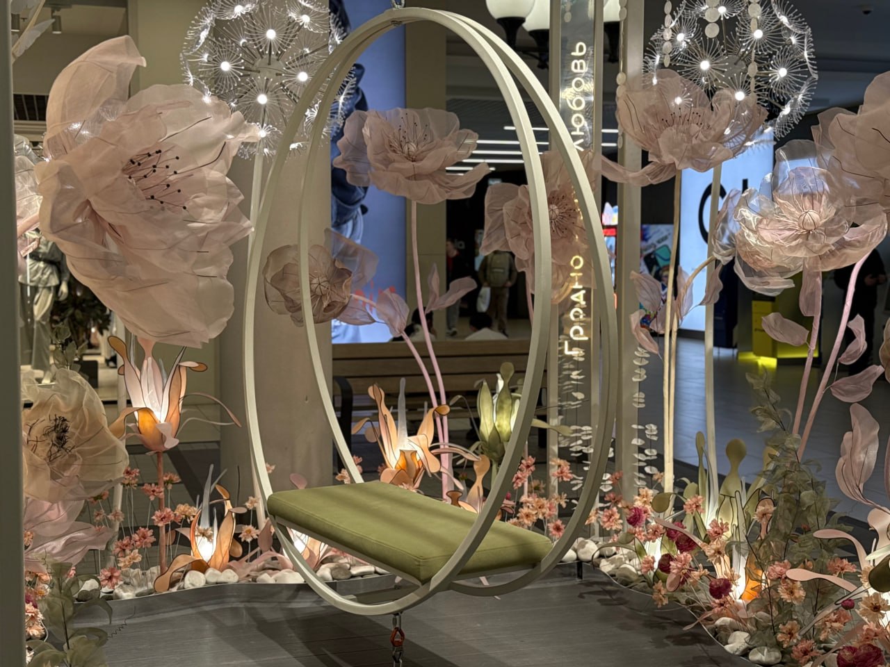 Фотозона получила название «Фантазийный цветущий сад». В отличие от стандартных щитовых конструкций, 90% элементов этой инсталляции создавались декораторами-оформителями вручную в течение месяца. Многослойная композиция наполнена объемом и воздухом: нежные фантазийные цветы, парящие бабочки, изысканные принты и легкие, струящиеся фактуры, натуральный ротанг, камни и мерцающий кварцевый песок. Пространство дополнено продуманными световыми сценариями, которые меняют настроение сада в течение дня.