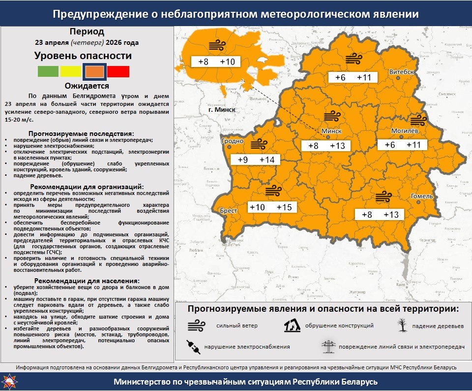 Белгидромет сообщает, что утром и днем 23 апреля на большей части территории республики и в Минске ожидается усиление северо-западного, северного ветра порывами 15-20 м/с.