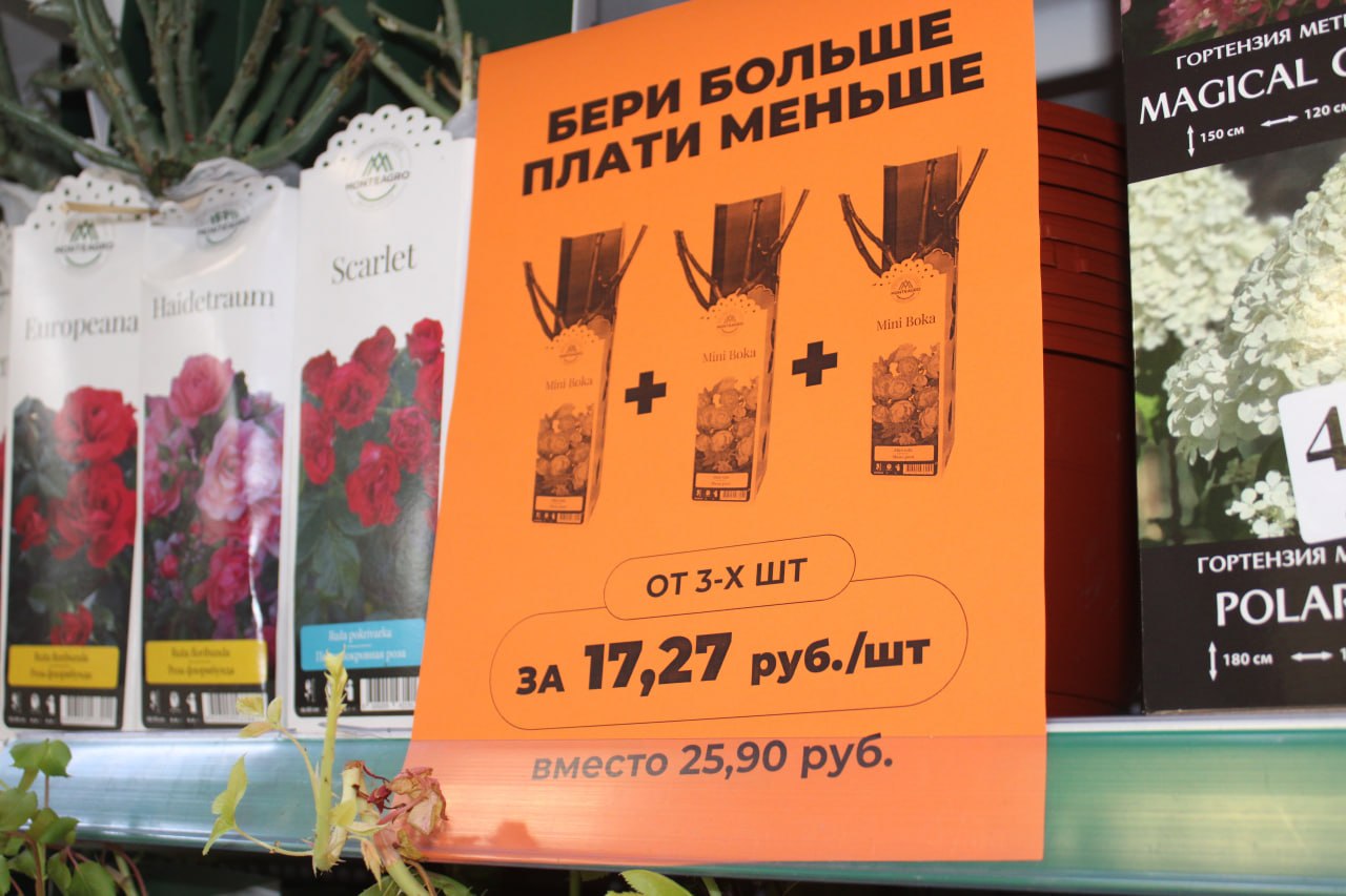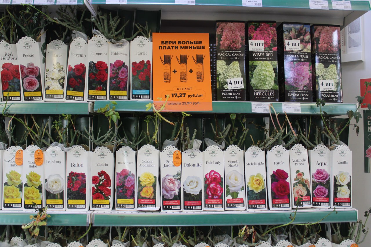 В садовом центре «Насенне» действует скидка на розы «Бери больше — плати меньше». При покупке трех и более саженцев цена ниже: вместо 25,90 рубля заплатите только 17,27 рубля.
